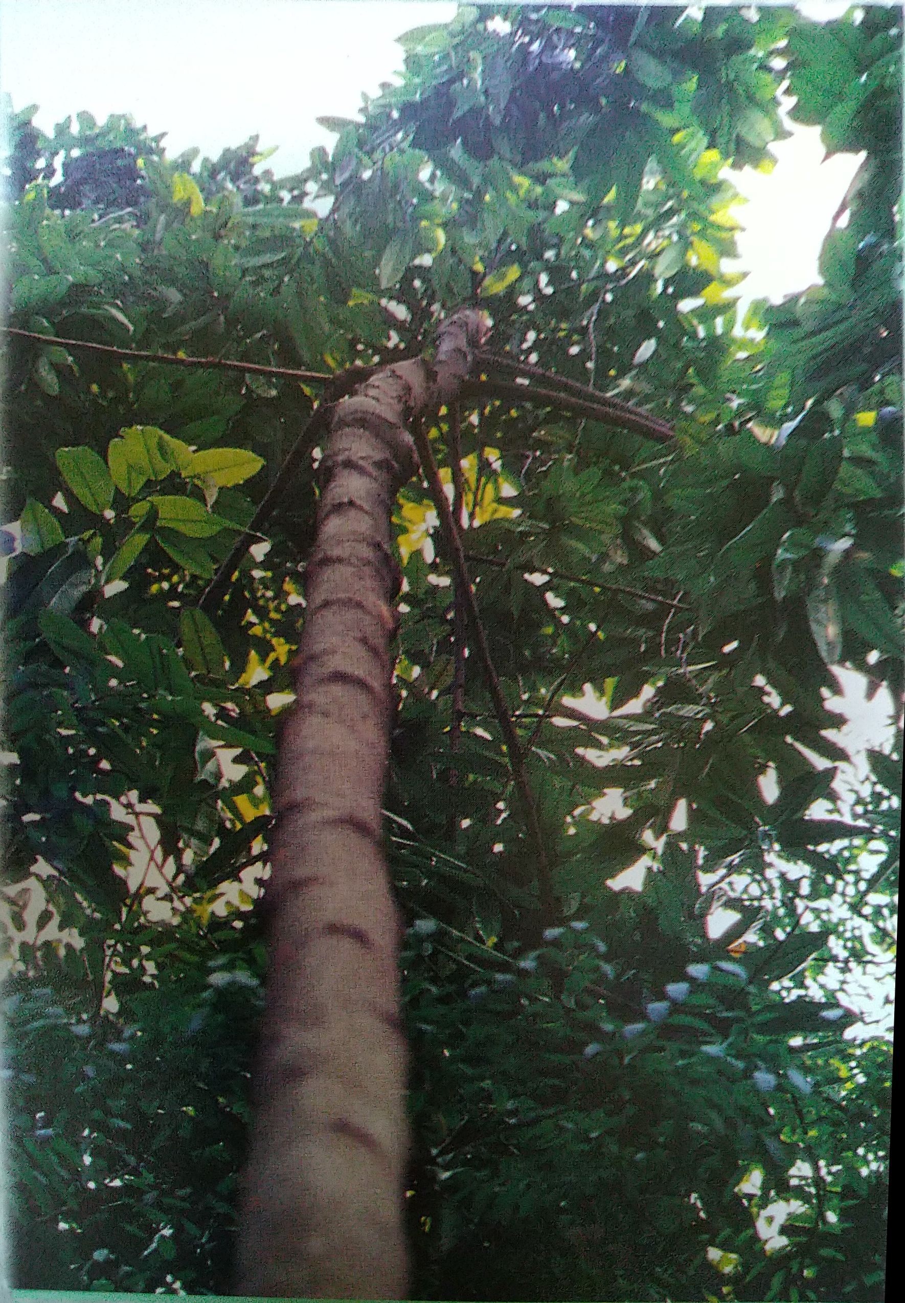 Deskripsi: Pohonnya tinggi sampai 35 m, diameter 70 cm, berbanir. Batang lurus, kulit hidup warna putih atau cokelat kekuningan, kulit luar hitam kecokelatan, beralur dangkal. Damar jernih berwarna putih sampai kekuningan. Daun bulat telur memanjang, atau lonjong, berukuran panjang 10-14 cm, lebar 4-6 cm, ujung meruncing, pangkal membulat, agak kaku, permukaan atas mengkilap, bila kering berwarna cokelat atau hijau kecokelatan, urat daun sekunder 8 pasang, kadang terdapat domatia. Tangkai daun +/ 1 cm.