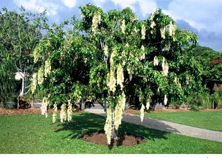 Deskripsi: Berhabitus pohon cemara berukuran kecil sampai sedang, tinggi dapat mencapai 6-15 m. Daun muda menyerupai saputangan putih lembut, tergantung vertikal ke bawah pada cabang-cabang pohon . Daun dalam beberapa hari berubah menjadi hijau, mengeras dan menjadi tegak. Daun majemuk pinnately, dan daun hijau tepi daun halus. Bunganya berwarna putih dan tumbuh dalam kelompok. Buah ini cokelat gelap, berbentuk seperti kacang sekitar 7 cm yang berisi satu biji kecil dan juga membentuk cluster padat di ujung ranting. Setiap kelompok lebih besar dari 30 cm.