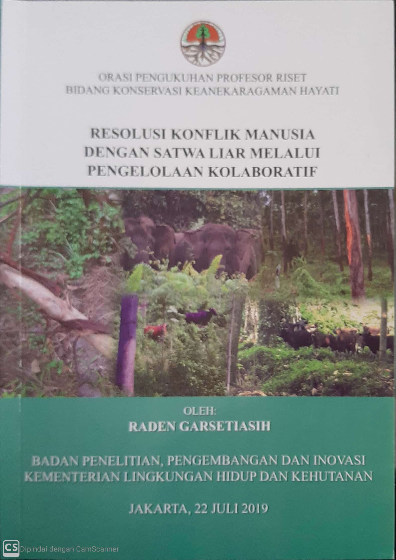Resolusi konflik manusia dengan satwa liar secara kolaboratif melalui kegiatan konservasi in situ, ex situ dan pengembangan ekowisata dapat melindungi populasi satwa liar, meningkatkan kesejahteraan masyarakat sekitar hutan sekaligus meningkatkan pariwisata/ekowisata. Buku orasi ini memaparkan perkembangan resolusi konflik antara manusia dengan satwa liar, faktor-faktor penyebab, dampak, strategi implementasi dan kelembagaan serta implikasi kebijakan.