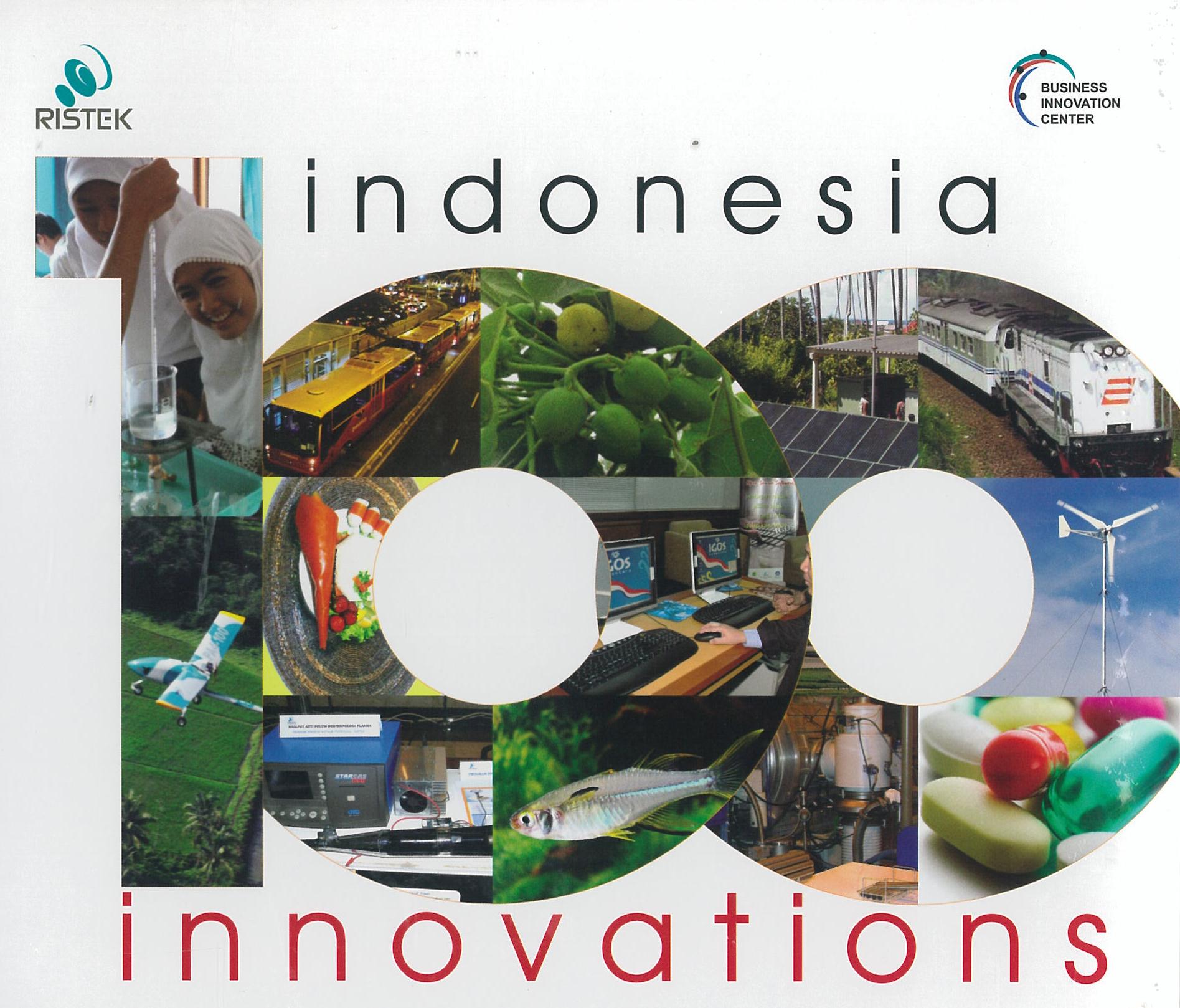 Abstrak: 100 inovasi Indonesia: A) Ketahanan Pangan:1) Kitosan dari limbah invertebrata laut sebagai bahan pengawet alami pada pengolahan ikan asin; 2) Inovasi produk ikan nila GESIT melalui pengembangan “YY” Male Technology; 3) Pemanfaatan wortel sebagai bahan balu vegetable leather bergizi tinggi; 4) TKM: Tempe kental manis; 5) Jamu sehat untuk unggas, 6) Keturunsn yang manis dan nirmanis; 7) Penebar pakan otomatis nan mandiri; 8) Apartemen bagi sang udang; dll; B) Energi Baru & Terbarukan: 1) Siklon api nan ekonomis; 2) Baterai lithium dari sumber lokal; 3) penyejuk udara yang sejuk di kantong; 4) Cooling tower sistem tertutup ekonomis; 5) Hybrid solar dryer untuk tembakau; 6) Pengering “3 in 1” sederhana ; 7) Pendulum yang bertenaga; dll; C) Teknologi & Manajemen Transportasi: 1) Landasan putar bebas hambatan; 2) menghentikan kereta api; 3) Kapal Katamaran bergelombang kecil; 4) Mobil listrik kompak dan efisien; 5) Mengatasi bisingnya rantai kendaraan; 6) Kotak hiyam “on-line”; &) Agar kereta lebih aman dan nyaman; dll; D) Teknologi Informasi & Komunikasi: 1) Batik+Matematika+Teknologi+Batik Fraktal; 2) layanan telepon untuk rakyat; 3) Pengukur berat kelas berat; 4) E-paper murah nanpraktis; 5) Pembaca meteran jarak jauh; 6) Suplai daya prosesor masa depan; dll; E) Teknologi Pertahanan & Keamanan: 1) PUNAI: Pesawat Udara Nir Awak Indoneisa; 2) Robot pemanjat tangga dan tanggul; 3) Robot pemotong kabel; F) Teknologi Kesehatan dan Obat-obatan: 1) Spirulinatex: spirulina di lembah latex; 2) Air murni dari laut; 3) Sukun: roti untuk jantung anda; 4) Radiodiagnosis untuk Hepatitis B; 5) Pendeteksi kanker untuk rakyat; 6) Jamu asam urat; 7) Mengembalikan Kuf dan TVC hemodialiser; 8) Listrik Murah Kualitas “Wah”; dll; G) Lain-lain: 1) Sarang laba-laba ramah gempa; 2) Papan wangi anti nyamuk; 3) Gabus busa alami; 4) Asap cair pengusir bau; 5) Rumah baru bagi si Pelangi Sulawesi; 6) Keramik ramah lingkunga; 7) Alternatif bernama biokomposit hijau; dll.