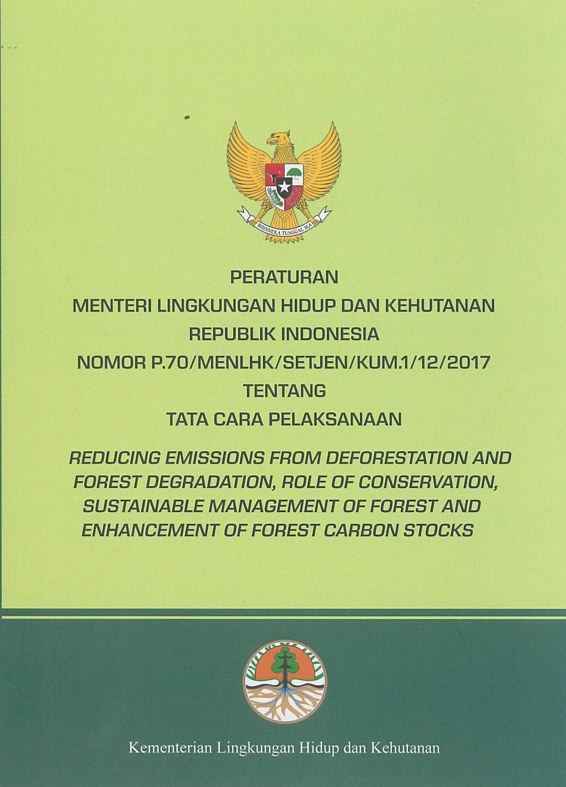 Peraturan Meteri Lingkungan Hidup dan kehutanan republik Indonesia Nomor P.70/MENLHK/SETJEN/KUM.1/12/2017 Tentang tata cara pelaksanaan Reducing emissions from deforestation and forest degadation,role of conservation sustainable management of forest and enhancement of forest carbon stocks