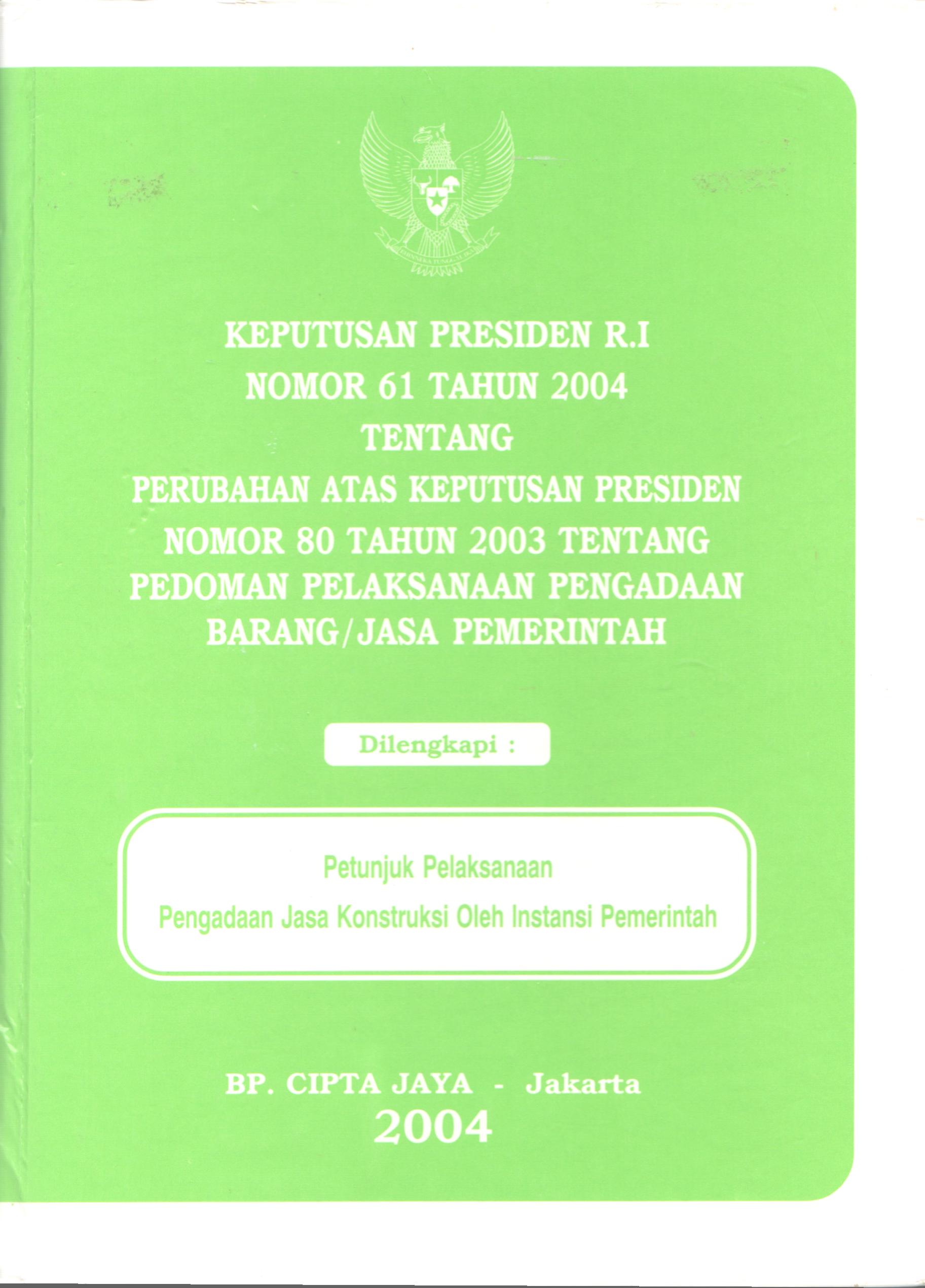 Keputusan Presiden R.I Nomor 61 Tahun 2004 tentang Perubahan Atas Keputusan Presiden Nomor 80 Tahun 2003 tentang Pedoman Pelaksanaan Pengadaan Barang/Jasa Pemerintah