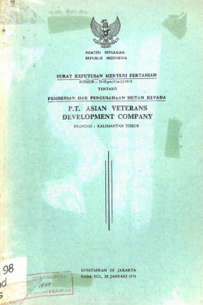 SK Menpan No. 35/Kpts/Um/1/1974 tentang Pemberian hak pengusahaan hutan kepada PT. Asian Veterans Development Company . Propinsi Kalimantan Timur