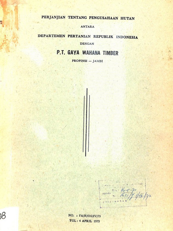 Perjanjian tentang pengusahaan hutan antara Departemen Pertanian RI dengan PT Gaya Wahana Timber: Propinsi Jambi