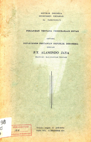 Perjanjian tentang pengusahaan hutan antara Departemen Pertanian RI dengan PT Alamindo Jaya: Propinsi Kalimantan Tengah