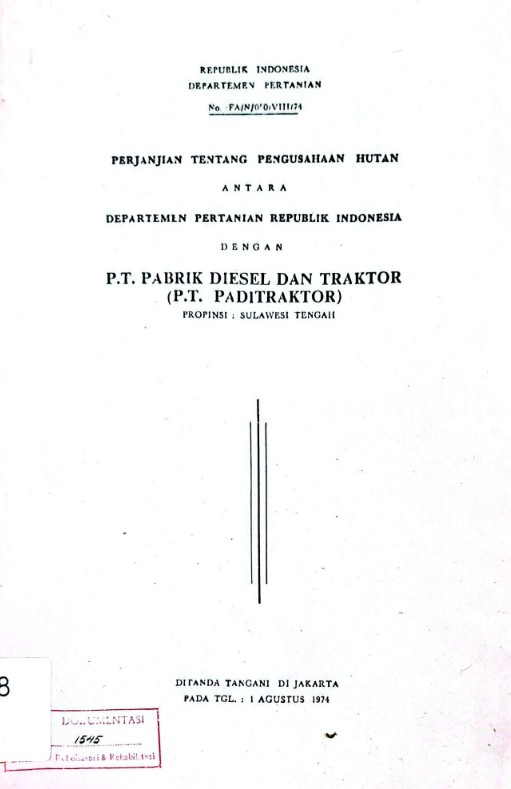 Perjanjian tentang pengusahaan hutan antara Departemen Pertanian RI dengan PT Paditraktor: Propinsi Sulawesi Tengah