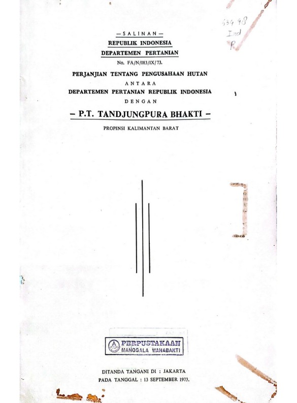 Perjanjian tentang pengusahaan hutan antara Departemen Pertanian RI dengan PT Tandjungpura Bhakti: Propinsi Kalimantan Barat