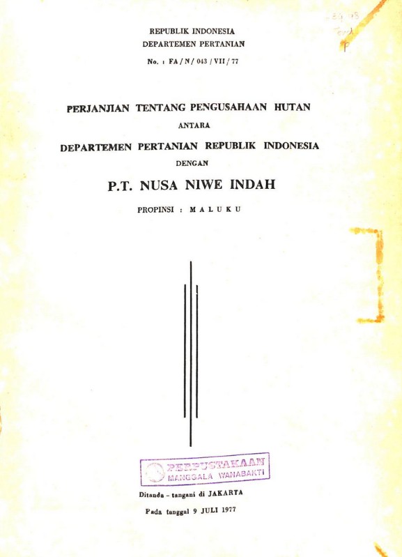 Perjanjian tentang pengusahaan hutan antara Departemen Pertanian RI dengan PT Nusa Niwe Indah: Propinsi Maluku