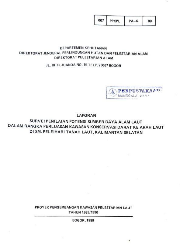 Laporan survai penilaian potensi sumber daya alam laut: dalam rangka perluasan kawasan konservasi darat ke arah laut di ...