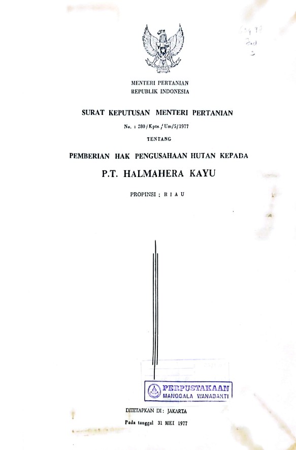Surat keputusan Menteri Pertanian ... tentang pemberian hak pengusahaan hutan kepada PT Halmahera Kayu: Propinsi Riau