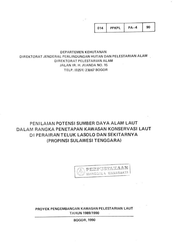 Penilaian potensi sumber daya alam laut: ... di Perairan Teluk Lasolo dan sekitarnya (Propinsi Sulawesi Tenggara)