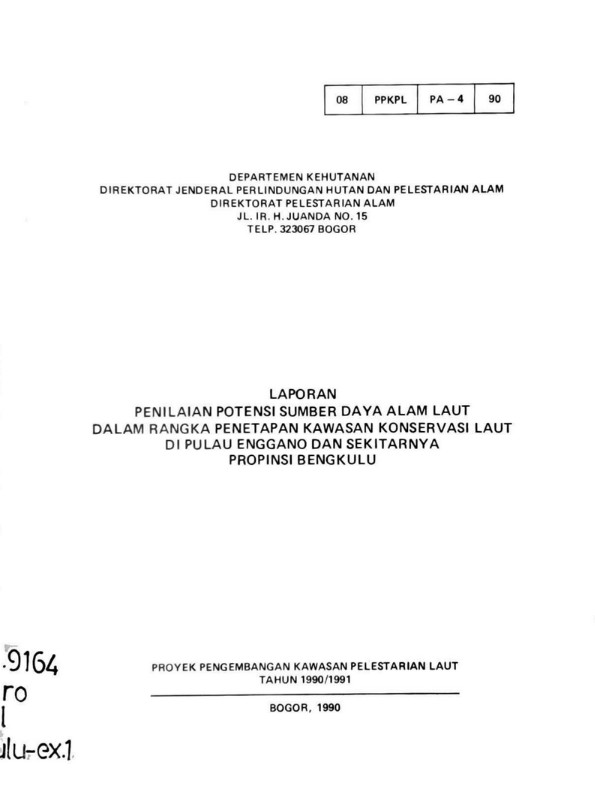 Laporan penilaian potensi sumber daya alam laut: dalam rangka penetapan kawasan konservasi laut di Pulau Enggano dan sekitarnya Propinsi Bengkulu