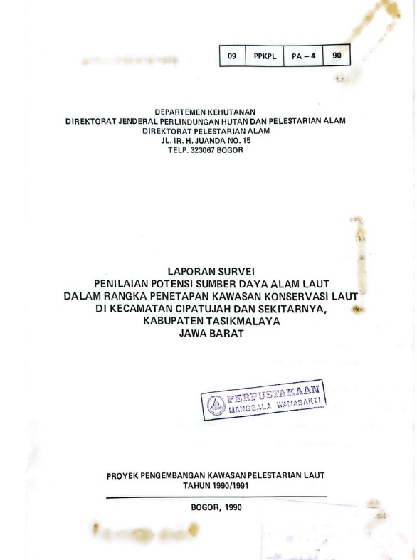 Laporan survei penilaian potensi sumber daya alam laut: dalam rangka .. di Kec. Cipatujah & sekitarnya Kab. Tasikmalaya Jabar
