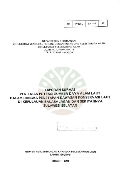 Laporan survai penilaian potensi sumber daya lam laut dalam rangka ... di Kepulauan Balabalagan dan sekitarnya Sulsel