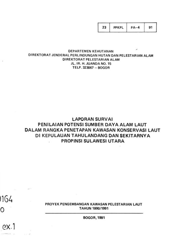 Laporan survai penilaian potensi sumber daya alam laut dalam rangka ... di Kepulauan Tahulandang dan sekitarnya Prop. Sulut