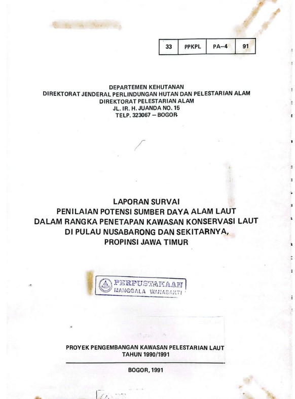 Laporan survai penilaian potensi sumber daya alam laut dalam rangka ... di Pulau Nusabarong dan sekitarnya, Propinsi Jatim