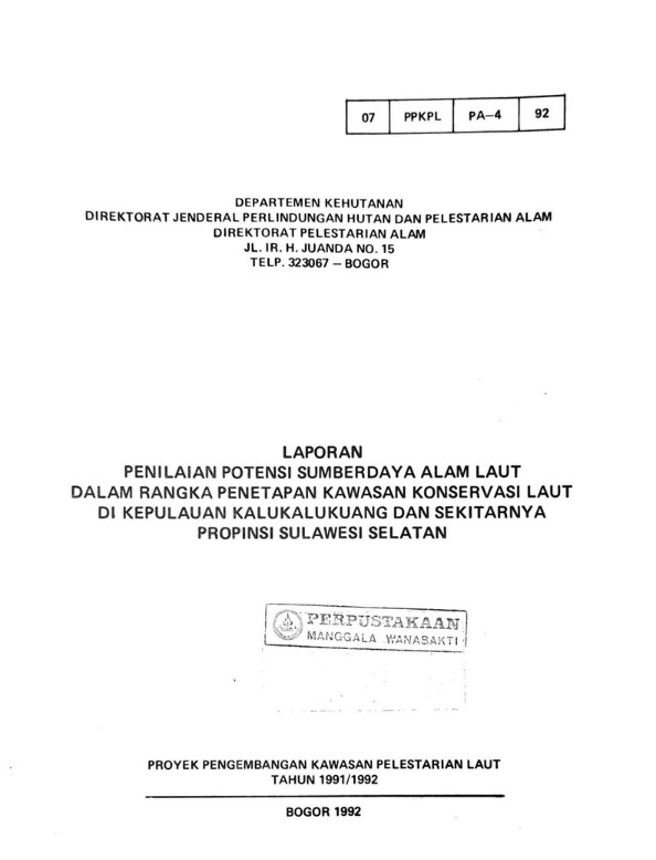 Laporan penilaian potensi SDA laut dlm rangka penetapan kawasan konservasi laut di Kep. Kalukalukuang ds. prop. Sulsel