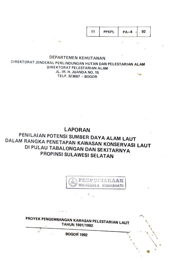 Laporan penilaian potensi SDA laut dalam rangka penetapan kawasan konservasi laut di P. Tabalongan ds. prop. Sulsel.