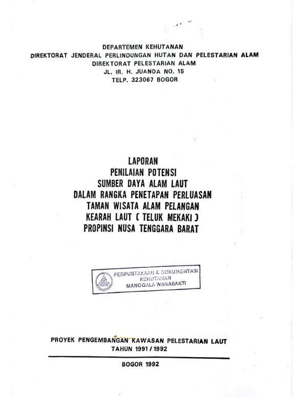Laporan penilaian potensi sumber daya alam laut dalam rangka penetapan perluasan Taman Wisata Alam Pelangan kearah laut ...