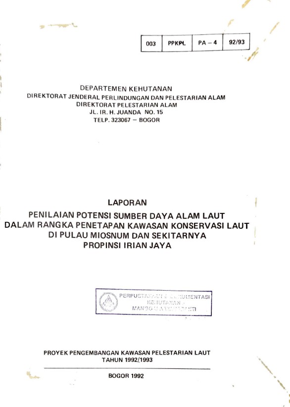 Laporan penilaian potensi SDA laut dalam rangka penetapan kawasan konservasi laut di Pulau Miosnum dan sekitarnya, Prop. Irja