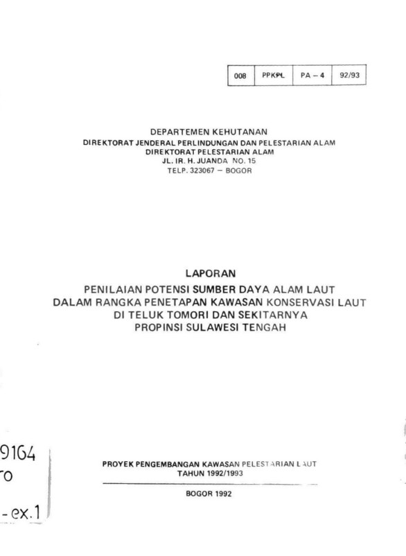 Laporan penilaian potensi SDA laut dalam rangka penetapan kawasan konservasi laut di Teluk Tomori ds Propinsi Sulawesi Tengah