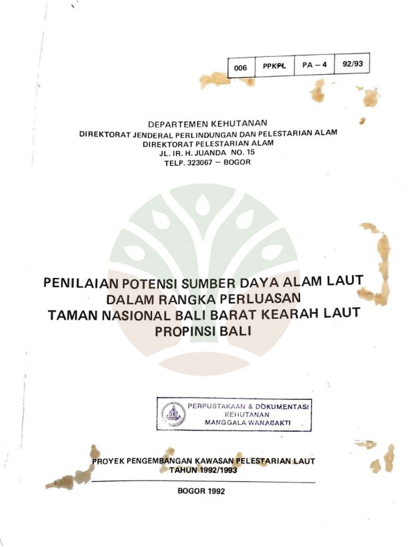 Penilaian potensi sumber daya alam laut dalam rangka perluasan Taman Nasional Bali Barat kearah laut Propinsi Bali